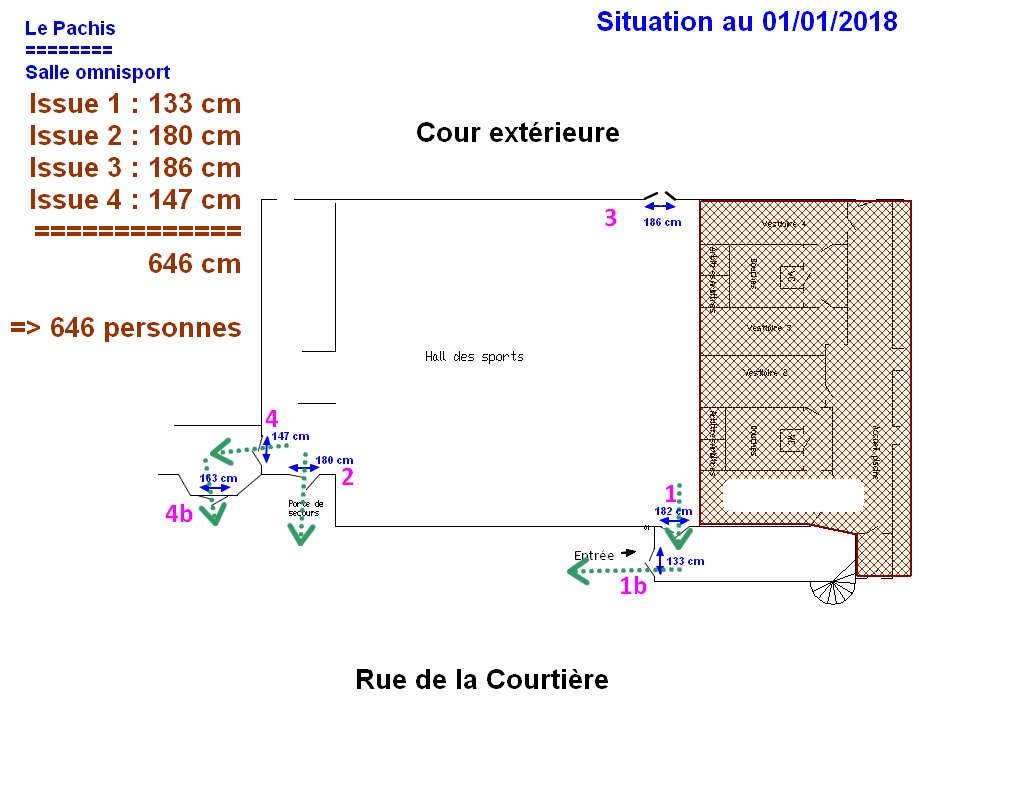 - Sanitaires : Femmes, 2 WC - Hommes, 1 WC et 2 urinoirs + éviers